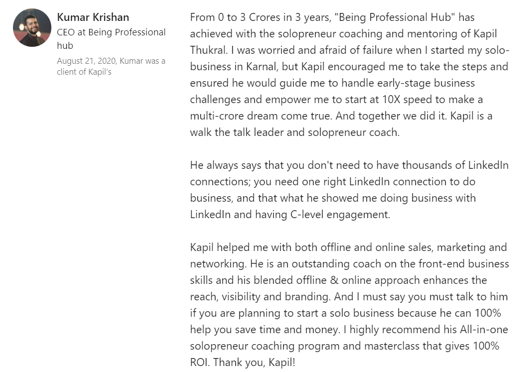 Don’t take our word for it. Google it or Visit LinkedIn to check the profile of the coach- Kapil Thukral.