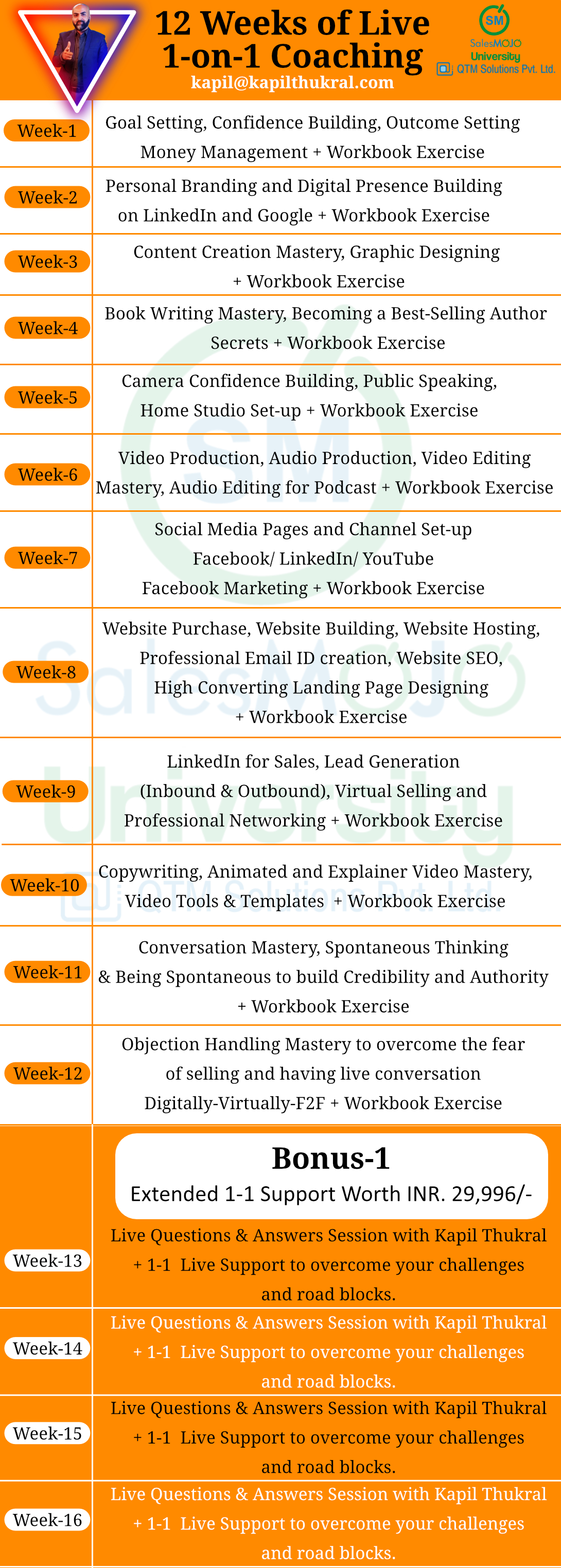 Relook at the weekly break-up of 1-on-1 coaching that we will cover: